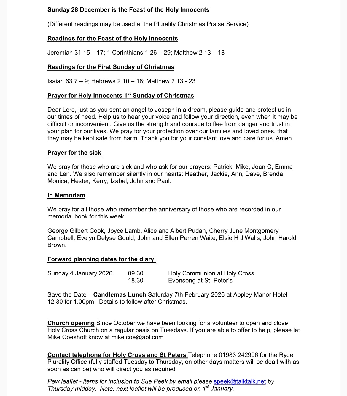 Pew Leaflet for the First Sunday of Christmas